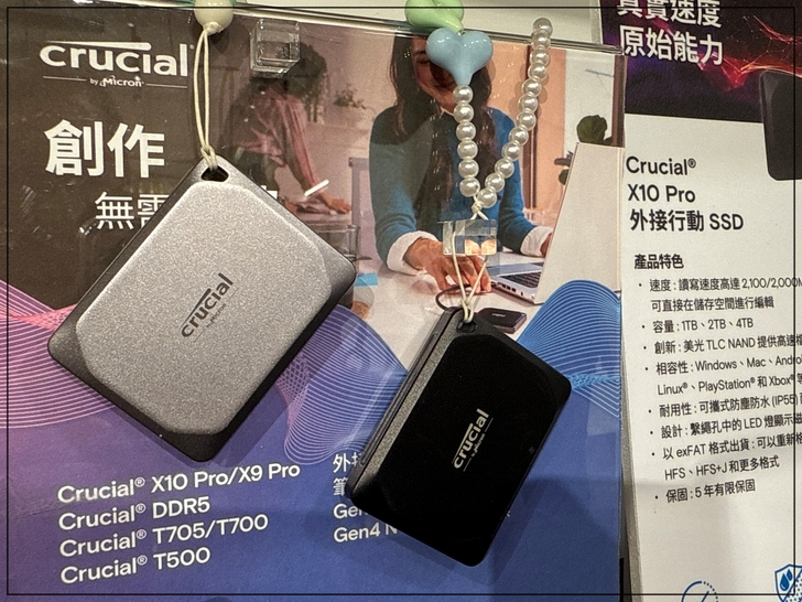 外接行動SSD:銀色的Crucial X9 Pro(讀寫1050/975MB/s)、黑色的Crucial X10 Pro (讀寫2100/2000MB/s),IP55防塵防水,大小約只有手掌的一半大,是容量焦慮者的最佳隨身救援神隊友。
