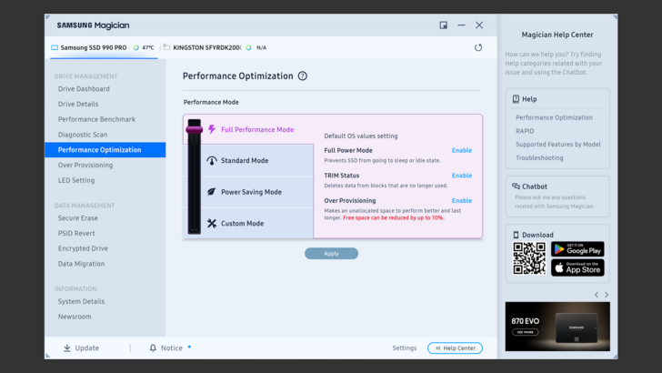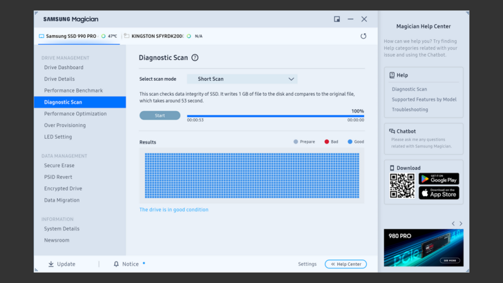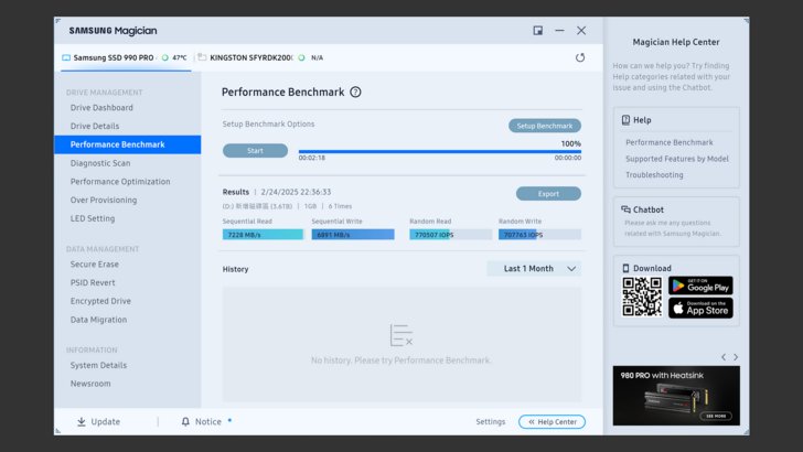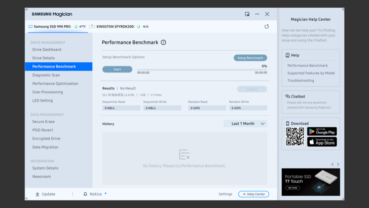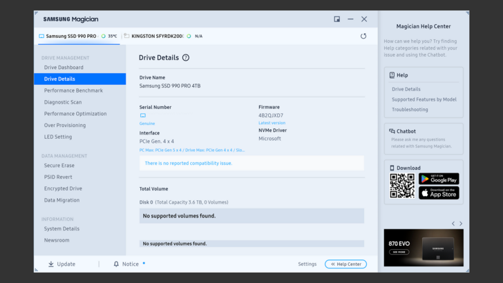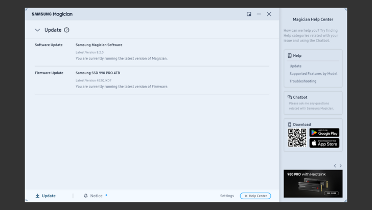 安裝好進入頁面後,我想說看看這條 990 PRO 4TB 的韌體是不是最新版本,目前顯示是最新版本 4B2QJCD7。順道一提,頁面也顯示 Samsung Magician 版本在 8.2.0。右邊的 Help Center 和下面的廣告,會常駐顯示,後面會一直看到他們,要忍耐一下。