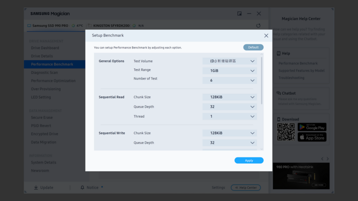 在「Setup Benchmark」中,可以個別調整測試的磁區、測試檔案大小、測試的次數。而針對測項部分,可以進一步調整區塊大小、佇列深度、執行緒,基本上也用過 CrystalDiskMark 的話,概念是一樣的,畢竟基本磁碟測試就是這些項目。不過 CDM 預設條件下通常也被稱為快樂錶,實際體驗通常不會到這麼高,但對於了解一顆磁碟的效能,還是很有幫助。