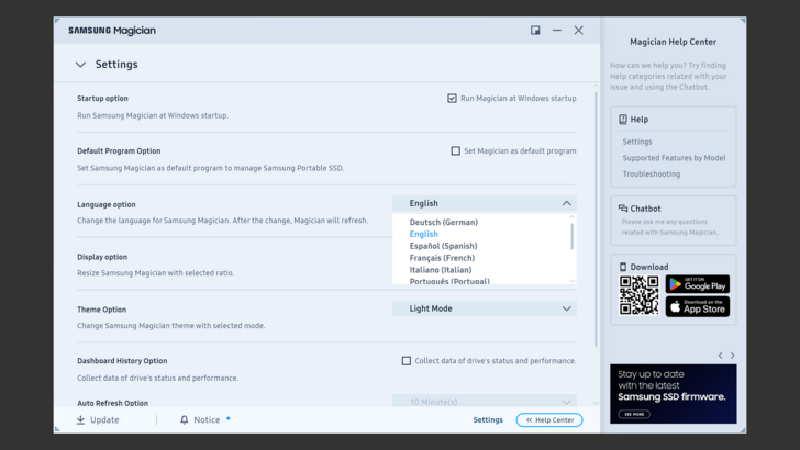 接著想說改個語言,中文介面有助於快速看到英文專有名詞,操作起來比較快。但是看來 Samsung Magician 只有簡體中文,沒有繁體中文的選項,就像 990 PRO 包裝上也沒有繁體中文。為了介面美觀,還是維持英文好了。