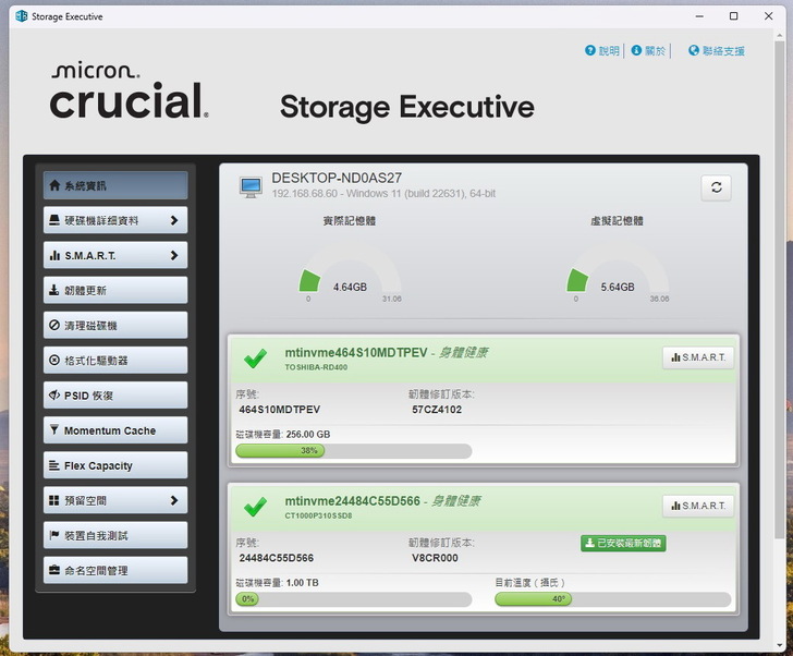 ▼ 打開美光軟體 Crucial Storage Executive,從資訊可以首到電腦裡面的所有硬碟,可以看到 型號、序號、韌體版本、容量、溫度。