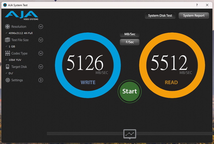 用4096x3112 10bit的Video Frame Size測試,測得 讀取 5512MB/s、寫入 5126MB/s。
