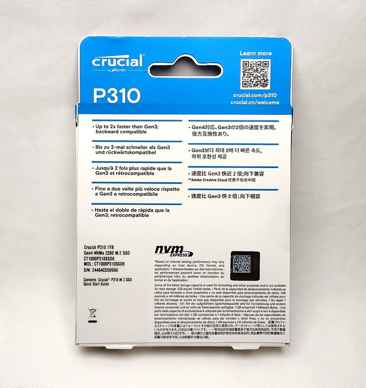 ▼ 包裝正面 可以看到 Micron Crucial Gen4 M.2 SSD 字樣,最大的字樣則為型號 P310;並且有產品形象圖。