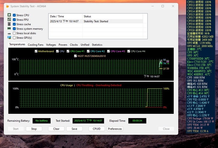採用AIDA穩定測試,全速運轉壓在98度、Package壓在180W上下