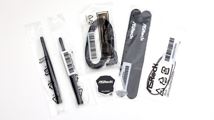 配件部分由左至右分別是天線、SATA 線、貼紙、M.2 螺絲、魔鬼粘束帶、熱敏電阻線。