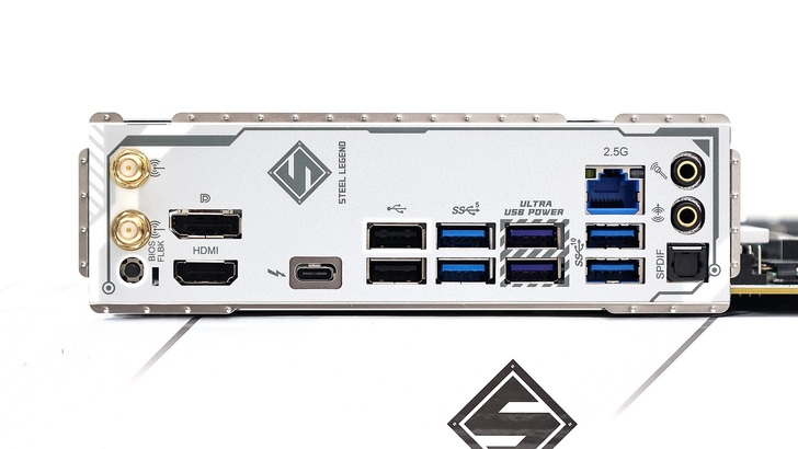 後 I/O 部分,頂部是無線接頭、BIOS FLBK 按鈕,一個 HDMI 支援 HDMI2.1 4K 120Hz,一個 DisplayPort 支援 DP1.4,一個 USB-C 支援 Thunderbolt 4,兩個 USB-A 支援 USB2 480Mbps,兩個藍色 USB-A 支援 USB3.2 Gen1 5Gbps,兩個紫色 USB-A 支援 USB3.2 Gen1 5Gbps 和 Ultra USB Power,一個 RJ45 支援 2.5GbE,兩個藍色 USB-A 支援 USB3.2 Gen2 10Gbps。