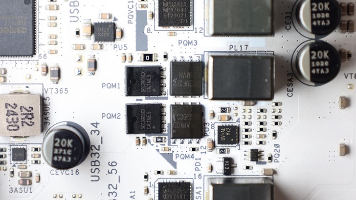 DRAM 部分有四條 DDR5 DIMM,一旁還有記憶體和主機板供電的零件。