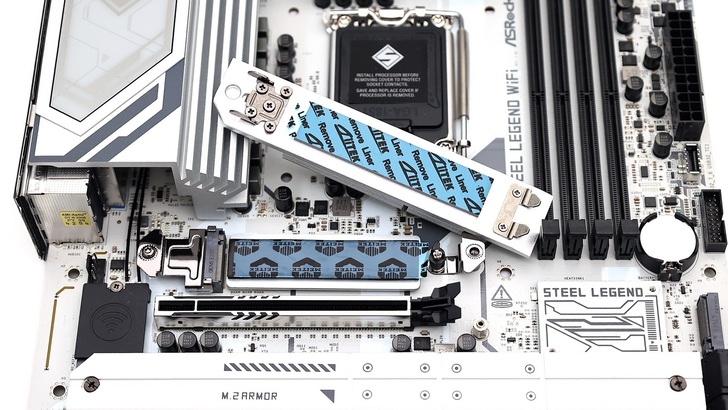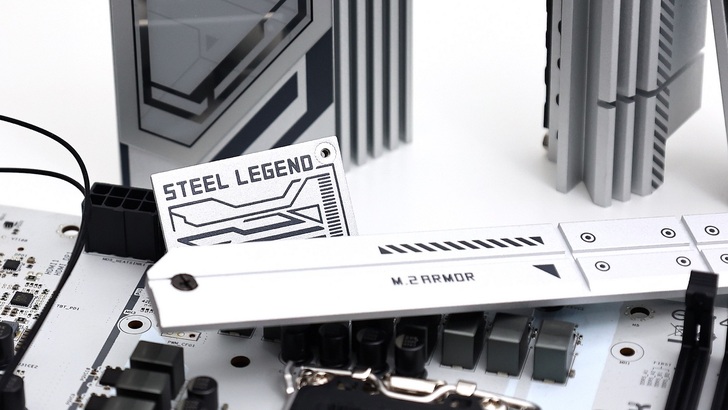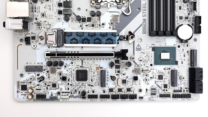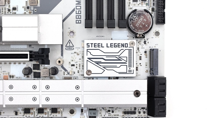 B860 Chipset 的部分,有一小片標示著 Steel Legend 的散熱鋁片,看來 B860 的發熱量真的不大。降低高度的散熱片,也讓一旁的 M.2 有安裝空間,直接跨越散熱片,將 SSD 安裝在上面。