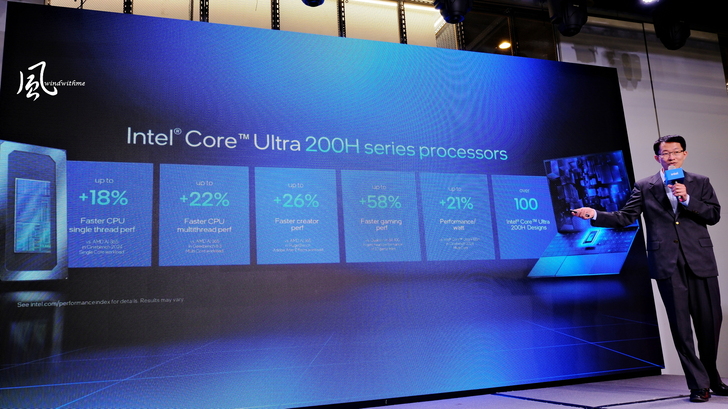 開場介紹筆電系列Core Ultra 200H與HX特色,藉由搭載目前最先進製程TSMC 3nm,200H系列比起14代同級處理器在單核、多工、創作、遊戲、能耗比等項目皆有明顯提升。