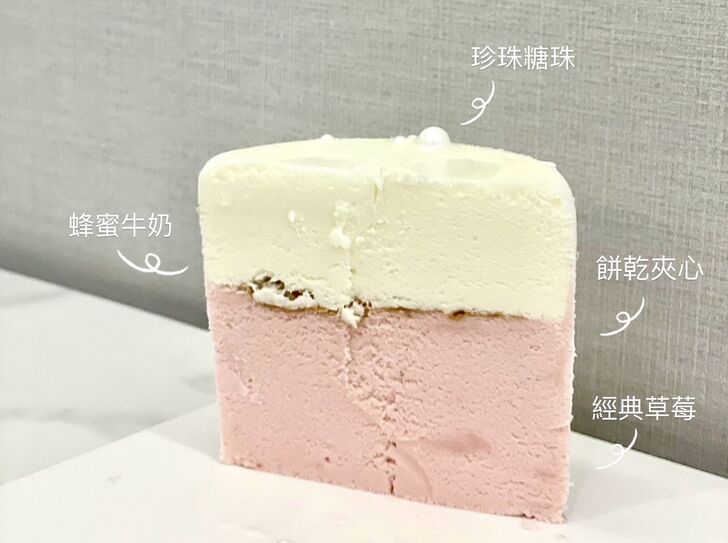 這款蛋糕以100%純乳冰淇淋打造,選用香甜草莓與濃郁蜂蜜牛奶作為雙層主體,內層巧妙藏入酥脆餅乾夾心,層次豐富、口感輕盈,讓人一口接一口停不下來。整體減糖設計,也貼心顧及媽媽的健康需求。