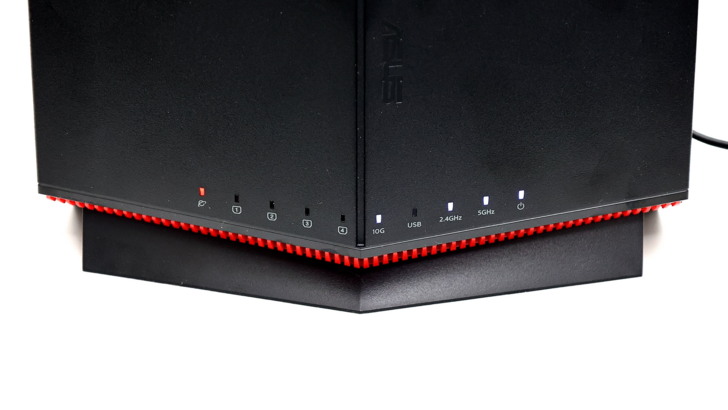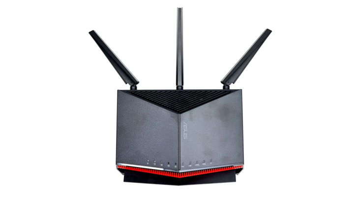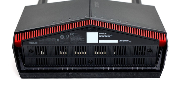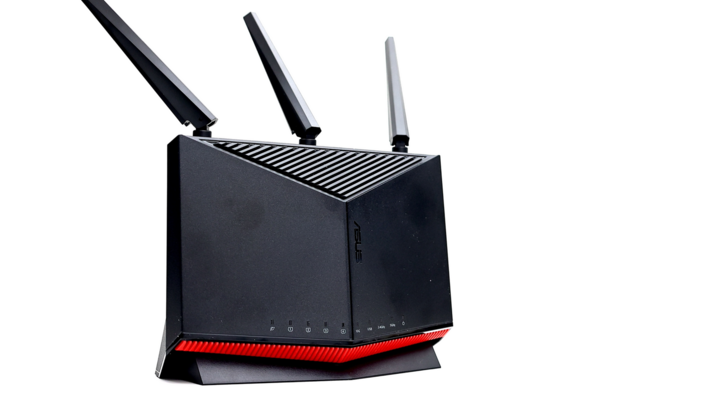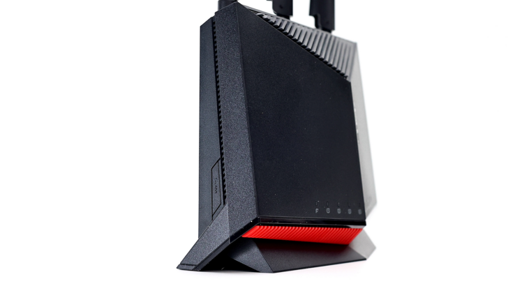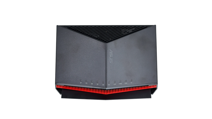 RT-BE86U 外觀大致延續了上一代的造型,可能就是頂部 ASUS 銘牌移到了前面中軸線旁邊,變得比較低調。機身依然是塑膠材質,並以紅色點綴。