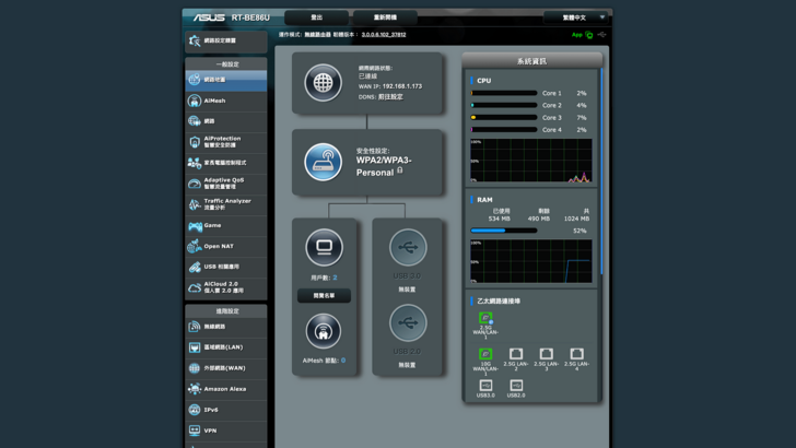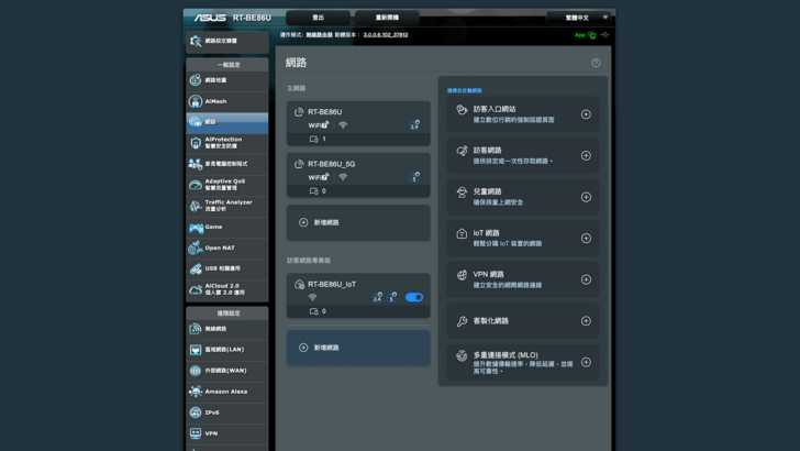 網路介面也可以看到,除了基本的 2.4GHz 和 5GHz 網路。也有訪客網路和 IoT 專用的網路,而且 IoT 網路不僅限於 2.4GHz,5GHz 也可以開。訪客入口網站,也讓 RT-BE86U 這樣的家用機種,可以做出小型商用網路會有的公共網路功能,對於餐飲店家來說滿適合的。