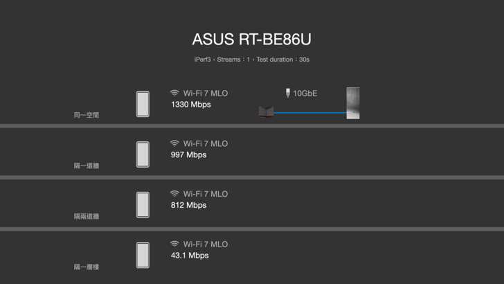 測試時主要使用 iPerf3。連接方面,RT-BE86U 的 10GbE 先連接到 10GbE Switch,再連接到 Windows 桌機。WiFi 7 裝置主要使用 ASUS Zenfone 12 Ultra,目前用這支手機體驗還不錯。雖然規格上覺得跟上一代 Zenfone 11 Ultra 體感沒什麼差,但是 AI 部分的應用真的是有感提升,是我現在用 Android 最多的情境。而 Zenfone 12 Ultra 支援 WiFi 7,因此這樣的測試可以作為參考。