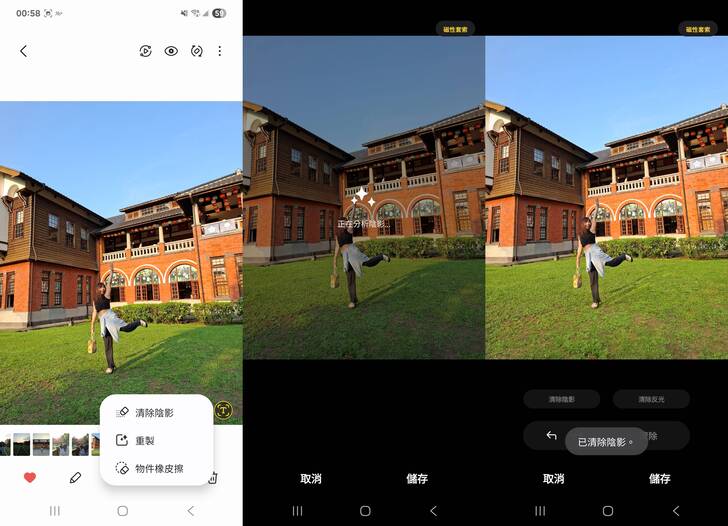 在強烈陽光下拍攝時,AI會主動建議清除陰影,只要點一下就完成,完全不用修圖經驗!