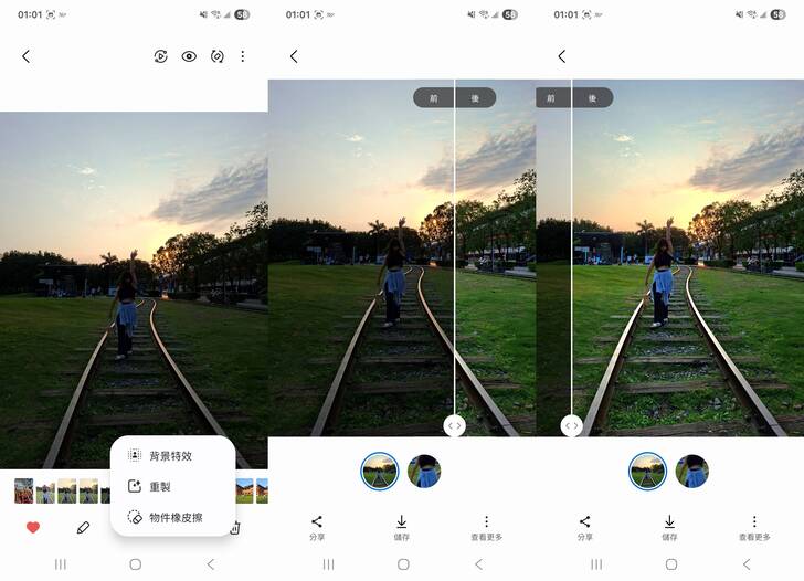 遇到逆光情況,也能自動出現「移除鏡頭眩光」選項,而且可以快速預覽修正前後差異,幫你拍出更完美的照片!
