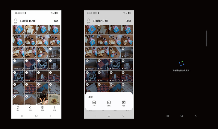 ▲ Samsung Galaxy A56 智慧影音剪輯(左至右)選擇需要的素材並建立電影