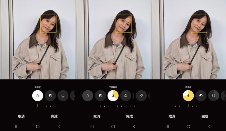 當然還有不可或缺的美肌效果,Galaxy A56 也搭配AI方式更方便後製修圖。可以調整許多功能的強弱,像是肌膚的平滑度、下顎輪廓線,顏色都可以做調整。不用擔心過於刻意或效果太假。