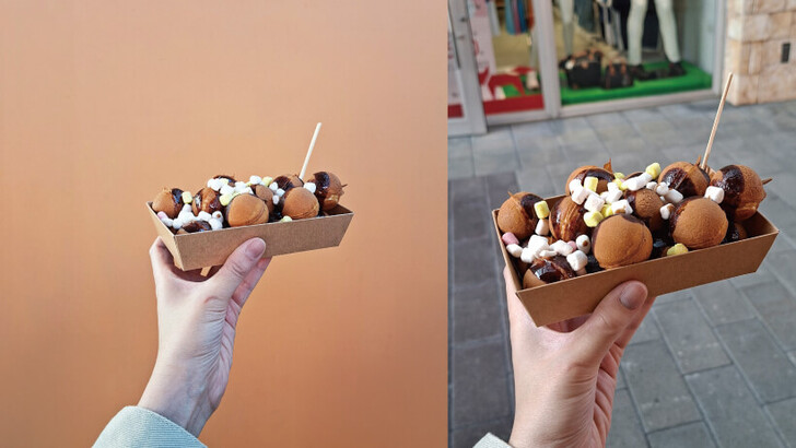 如果你是美食創作者,A56的顏色表現應該會讓你很滿意。它的對焦速度快、畫面清晰,色彩也自然不過飽,像這張蛋蛋球的照片,巧克力醬和棉花糖的細節都拍得很乾淨,整體畫面就很好吃