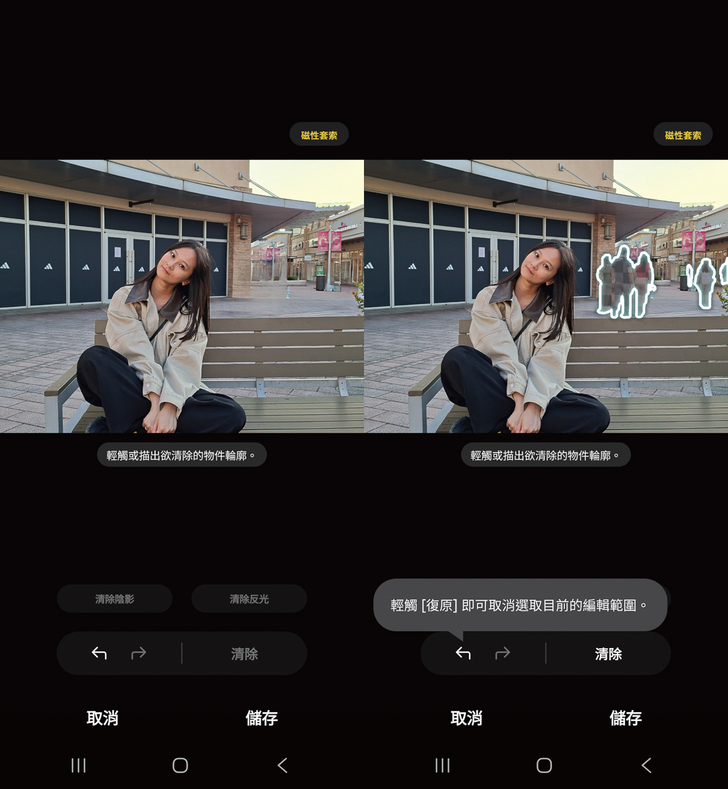 另外是物件橡皮擦,導入AI後,可以針對在戶外的人群或是雜物都可以去除,並生成內容填補,讓照片更乾淨自然。
