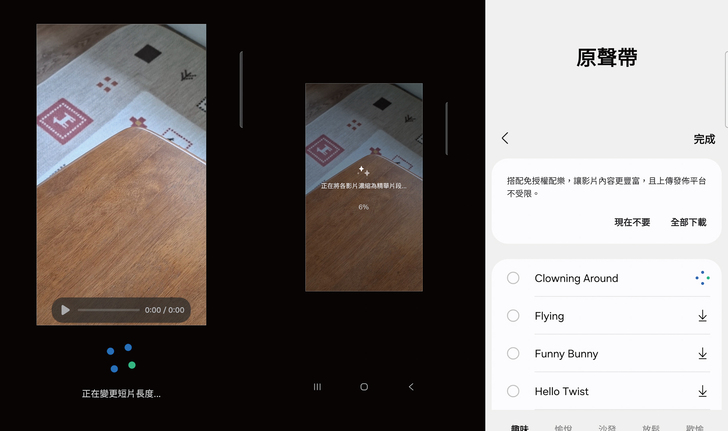 ▲ Samsung Galaxy A56 智慧影音剪輯(左至右)自行調整長度並加入背景音樂素材