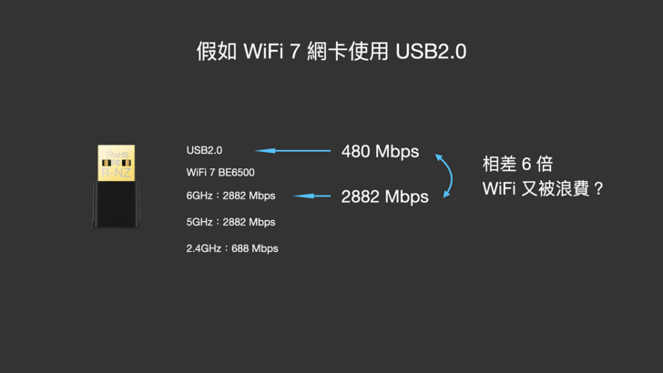 WiFi 7 時代,2x2 的天線可以達到 2,882Mbps。先不考慮 USB 是全雙工、無線網路是半雙工,如果還用 USB2 的話,理論值 480Mbps,只有 WiFi 7 的 1/6,代表 USB 才是整個裝置的瓶頸吧!