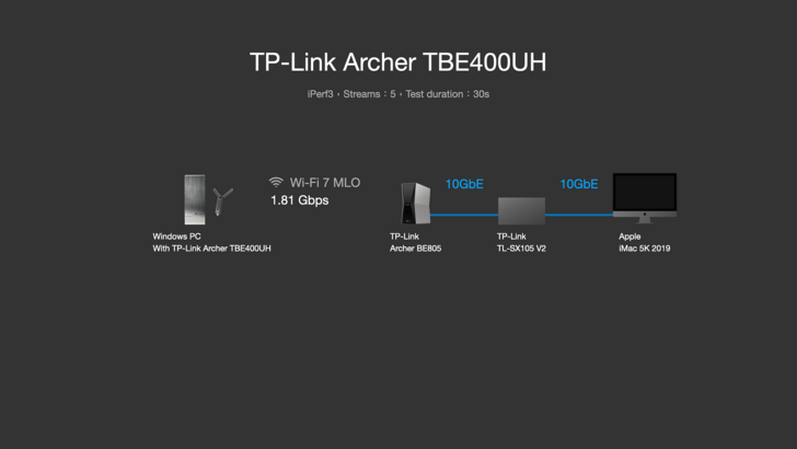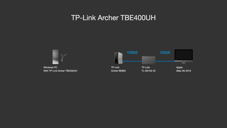 TBE400UH 接上電腦後需要安裝一個驅動,裝好後就可以看到可以使用無線網路連接。BE805 設定完成後,先將 10GbE 接到 TP-Link TL-SX105 這台 10GbE Switch,然後再接到另一台能使用 10GbE 的電腦。