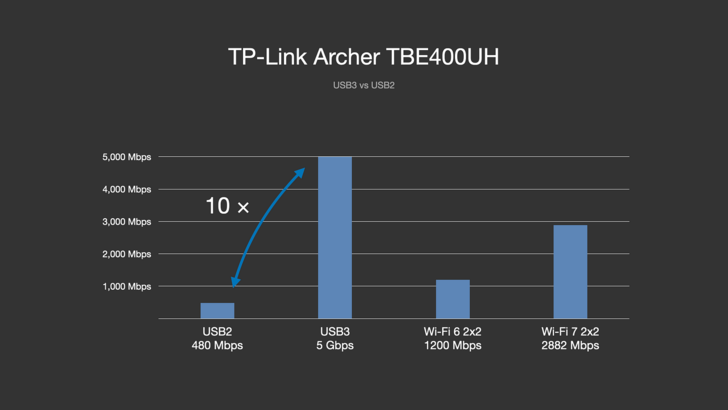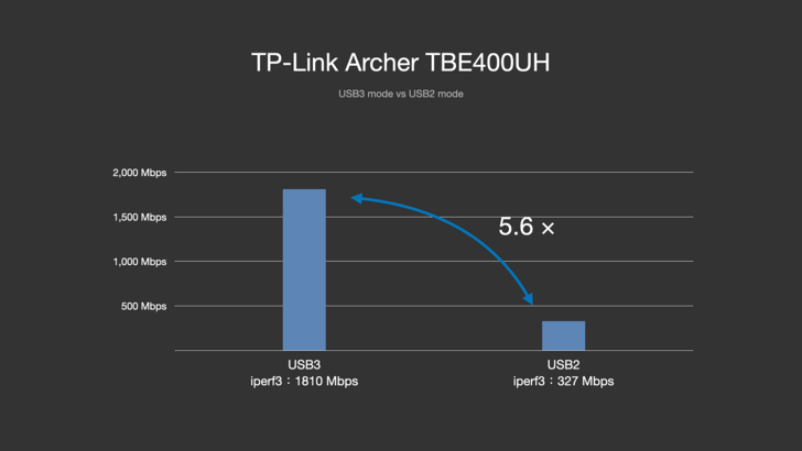 不管是什麼品牌的 WiFi 網卡,只要他速度超過 USB2,卻用 USB2 當作連接介面,勢必都會影響到速度發揮。現在 WiFi 6、WiFi 6 又是 USB2 的好幾倍以上,輕輕鬆鬆都超過這個速度上限,像 TP-Link Archer TBE400UH 這樣的產品用上 USB3 也是必然的了。大部分的網卡,並不會在購買頁面或官網寫出他們的速度多少,消費者只能從規格做個大致判斷,那 USB 是什麼規格就是一個關鍵。當然實際上還是要多查查實測速度,確保實際上跑起來真的能達到預期。