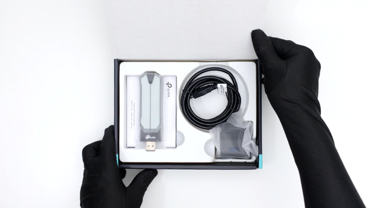 打開 TP-Link Archer TBE400UH 盒裝後,左邊是網卡本體,右邊是延長線底座。我才想到,哦~官網好像有標出延長底座,怪不得有附,就當贈品吧。質感是不錯的,滿有份量感,將近 100g。