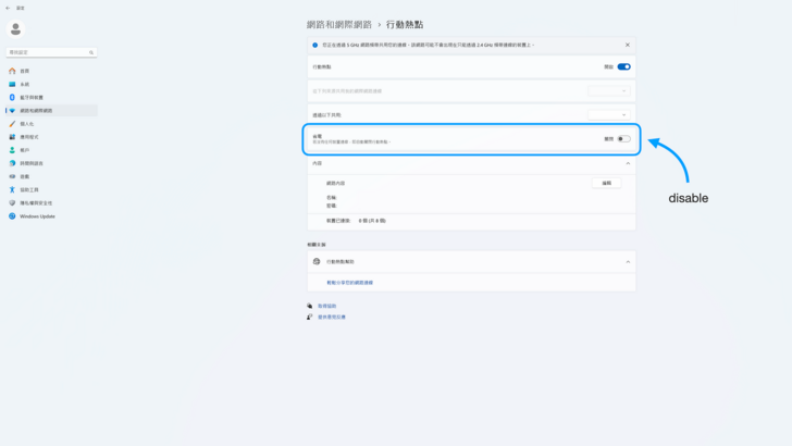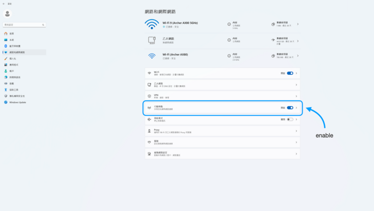 除此之外,USB 網卡還有一些玩法。在 Windows 的設定中「網路和網際網路」下,可以看到「行動熱點」,就跟手機上面的意思是一樣的。例如電腦已經有接有線網路或其他網路來源,而且有個閒置的網卡,就可以將電腦開熱點給別人連。當然如果關機的話,這個熱點就結束了,所以比較適合用 Windows 作為 DIY NAS 或是家庭劇院,這種平常不太會關機的機種。