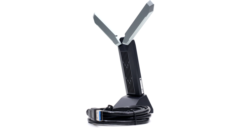 論造型的話,還是滿酷的,沒想到網卡還可以有變身功能。平常收起來就像一個瓢蟲。無線規格部分,不僅支援 5GHz 和 2.4GHz,也支援 6GHz。