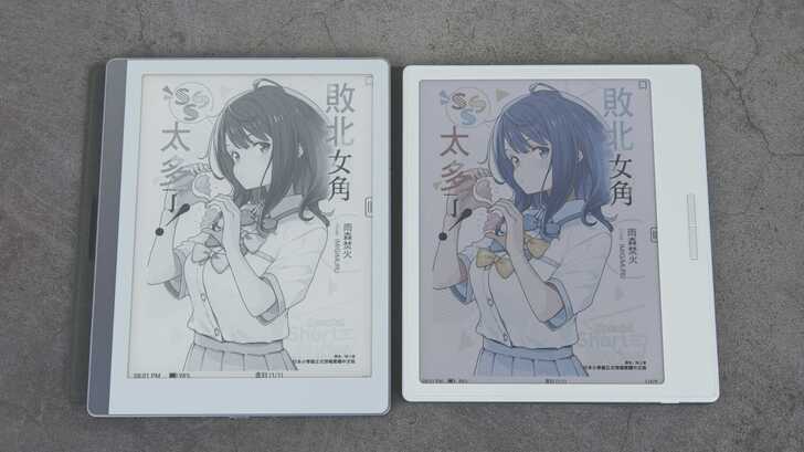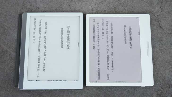 BOOX Go Color 7(右)搭載元太的 Kaleido 3 彩色電子墨水螢幕,相比 BOOX Leaf(左)的元太 Carta 1100,最大的變化就是多了 4096 種顏色的顯示。但由於 Kaleido 3 面板的顯示技術,是以黑白底層墨水搭配彩色濾光片來達成彩色顯示,因此其對比度和底色純淨度,效果不如 Carta 純黑白螢幕那麼好。