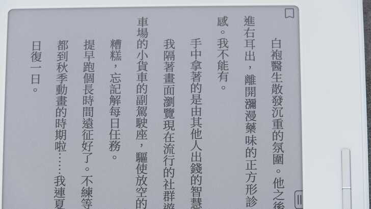 對於我而言,電子閱讀器相比平板和手機最大的差異莫過於閱讀的舒適度。手機和平板看久了容易眼睛痠澀。但電子閱讀器其類似紙張的顯示方式,使得長時間閱讀較不易產生負擔。對我這樣上班長時間盯著螢幕的人來說,能夠在休閒時讓眼睛放鬆一下,可說相當重要。相比手機、電腦和平版螢幕透過 LED 的主動發光照射出內容,電子閱讀器的電子紙是透過改變螢幕上「墨水」的顏色,再藉由自然光或是前光燈反射內容到眼睛。這種被動的顯示看起來舒服很多。如果要類比的話,大概就是直接看手電筒發光處,和看手電筒照亮的地方之差異。