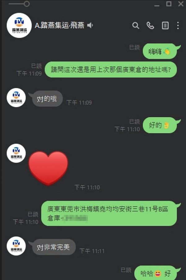 「請問這次還是用上次那個廣東倉的地址嗎?」
