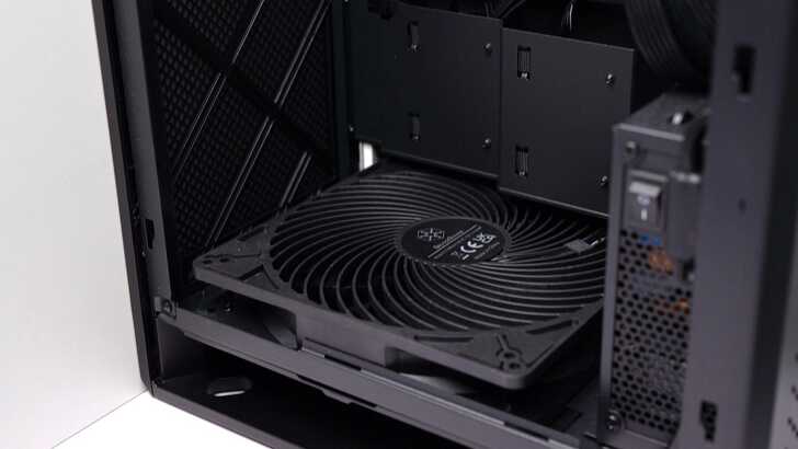 機殼底部預裝一顆 180mm 穿甲彈風扇,機殼採用由下而上的垂直風流,透過煙囪效應更快地將機殼內熱源排出去,機殼也能稍微減少累積由上掉落的灰塵。