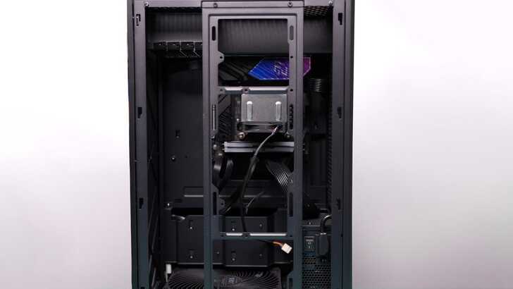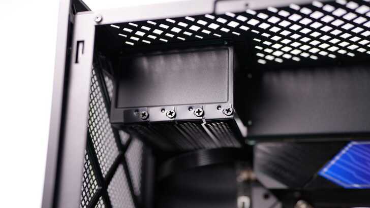 機殼側邊的可拆式支架可以選擇安裝 360mm 水冷或是 2.5/3.5 寸硬碟。主機板的安裝方式為選旋轉 90 度,I/O 面板是朝上的,會有上蓋擋住,不用特別擔心灰塵積在接頭內,不過有個小缺點就是如果你的主機板 Wi-Fi 天線是直接鎖在主機板上兩根那種,被蓋住時訊號可能就會受到影響。