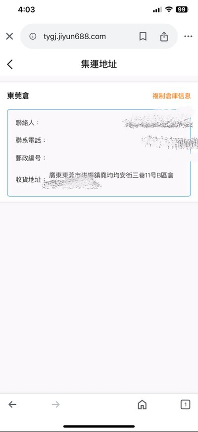 ▲這是他們的倉庫地址頁面,淘寶結帳後記得來這邊複製地址