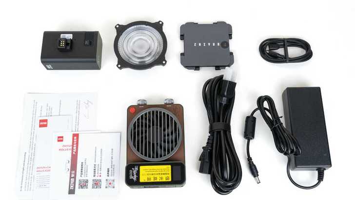 所有配件由左至右,由上而下分別是電池、菲涅耳透鏡、四葉檔光板、100W USB-C to C 充電線、說明書、MOLUS X100 RGB 本體、AC 電源線和電源供應器。