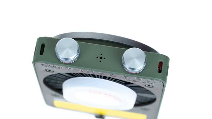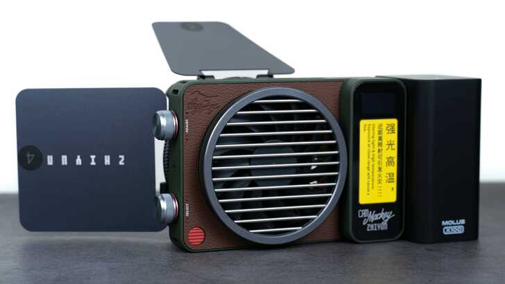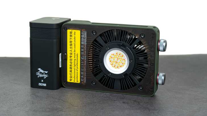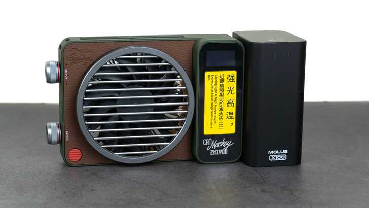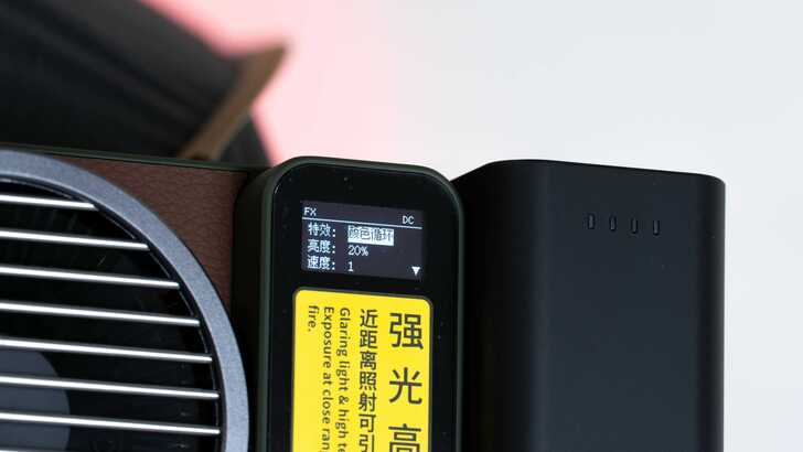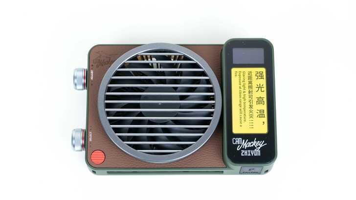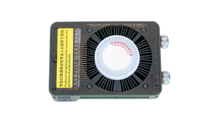 首先看到智雲 MOLUS X100 RGB 補光燈本體,背面可見一個類似相機的握把,配有一個 LED 螢幕和與精美外觀相當違和的警告標語。外表材質為塑膠,其中風扇面採類皮革設計,搭配顯眼的紅色的電源按鈕,設計相當獨特。
