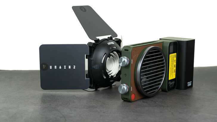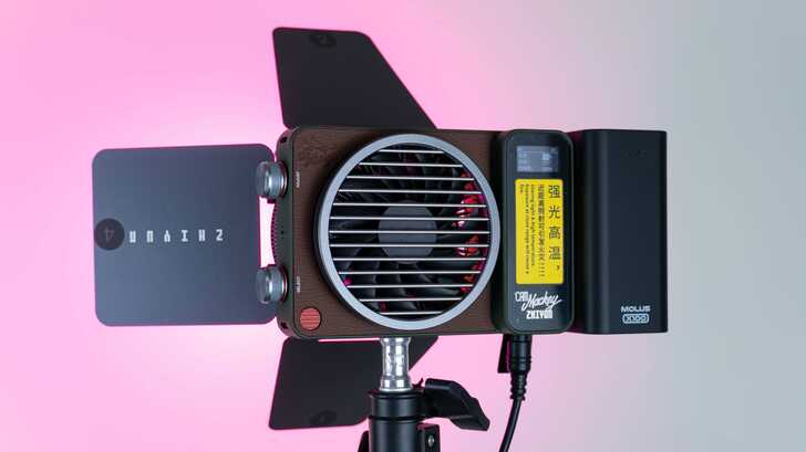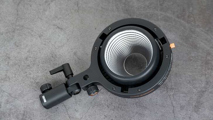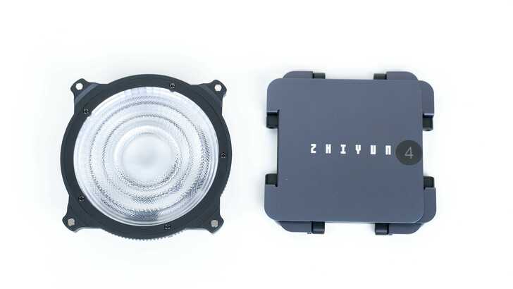 菲涅耳透鏡是以 ZY 卡口與 MOLUS X100 RGB 補光燈連接,而四葉檔光板則是磁吸固定在菲涅耳透鏡上。