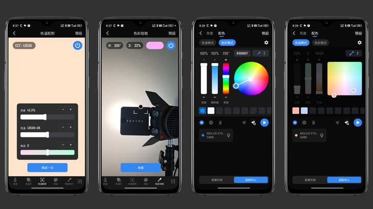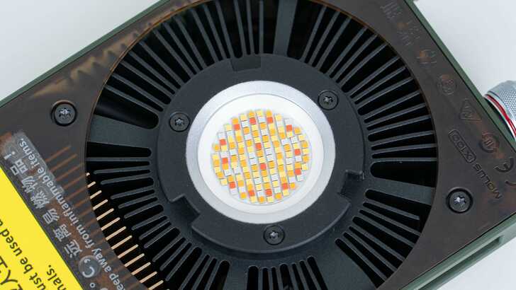 與一般攝影燈的 COB 封裝不同, MOLUS X100 RGB 為了 RGB,改用了多個顏色的 LED 燈珠排列,組合成 RGB 燈光。CCT 2500K-10000K 的色溫,並且有 CRI ≈ 95 和 TLCI ≈ 97 的顯色指數,裸燈照度可達 3,110Lux。