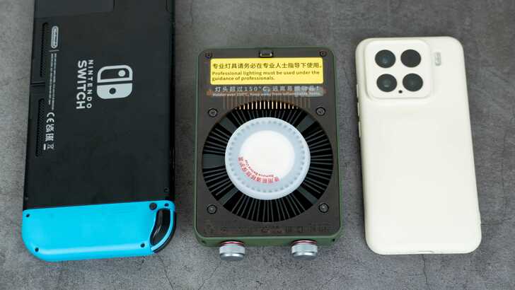 比一下大小,MOLUS X100 RGB 的燈具本體真是小巧,不考慮厚度的話與旁邊小手機著稱的小米 15 差不多大。