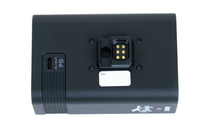 如側邊的接口所示,該電池可藉由卡榫與攝影燈連結,使電池能以 100W 釋放它的電量。平時也可透過 USB-C 作為行動電源使用。