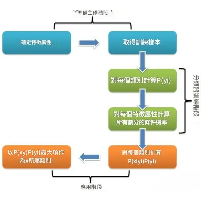 假設輸入的不同特徵之間是獨立的,基於機率論原理,透過先驗機率P(A)、P(B)和條件機率推算出後機率出P(A|B)。
