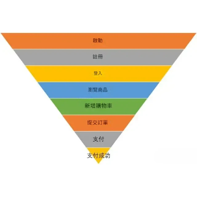 案例中,電商漏斗可用如下圖表示,註冊、登入一般是新使用者才有的環節,對老使用者而言則是啟動、瀏覽商品直至最後支付成功的環節。