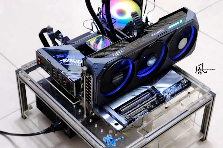 側邊GIGABYTE標誌使用滑動側板設計,透過白色透明LED燈條,將GIGABYTE標誌往左側GEFORCE RTX滑動,創造可動式的燈效視覺。