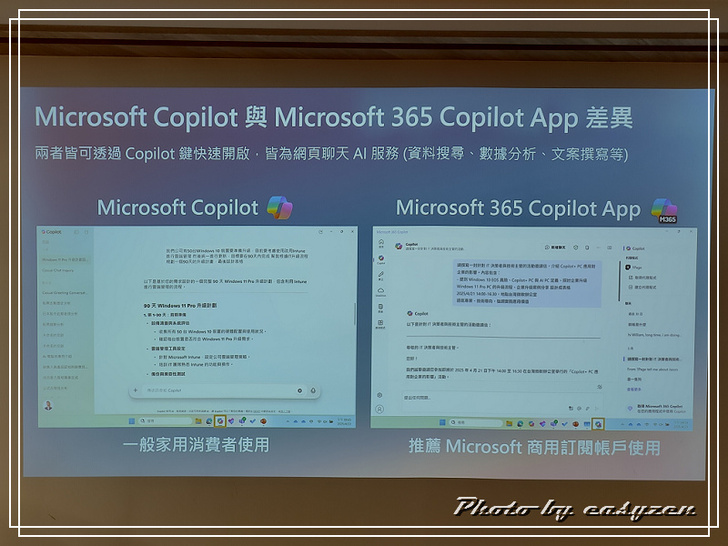 共同點:: 兩者皆可透過Copilot 鍵快速開啟,並提供網頁聊天AI 服務,功能包含資料搜尋、數據分析及文案撰寫等。