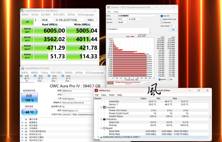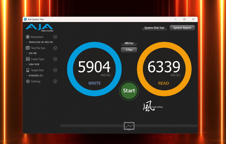CrystalDiskMark最高連續讀寫達6000與5900 MB/s、AJA System Test最高讀也達到6300與5900 MB/s,都超越上一代TB4頻寬40 Gbps與測試效能約3000~3900 MB/s的表現。