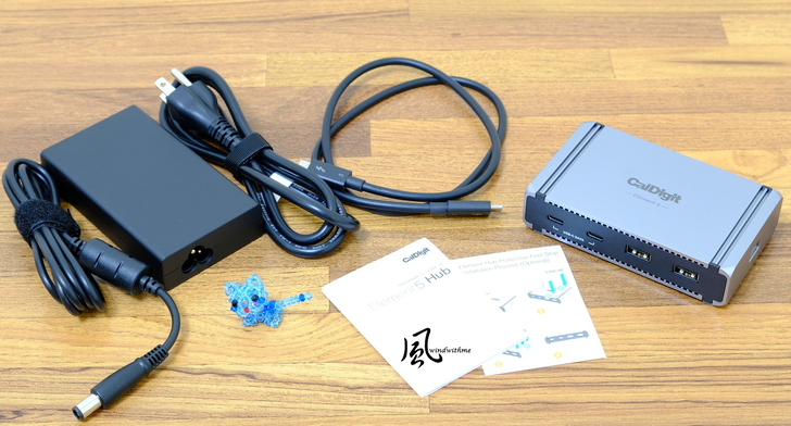 內容物有Element 5 Hub、TB5連接線、底部軟墊、180W變壓器與電源線。