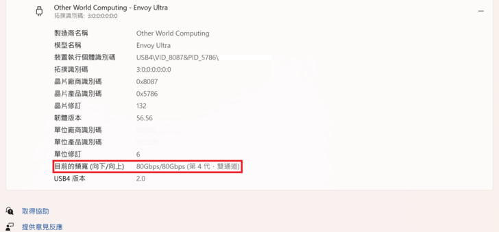 Windows內USB頁面中可以看到目前的雙向頻寬為80 / 80 Gbps。