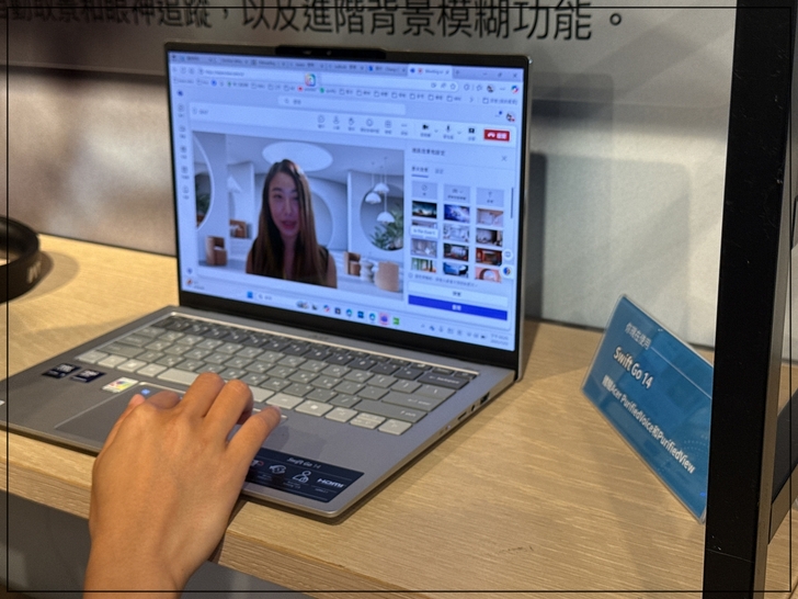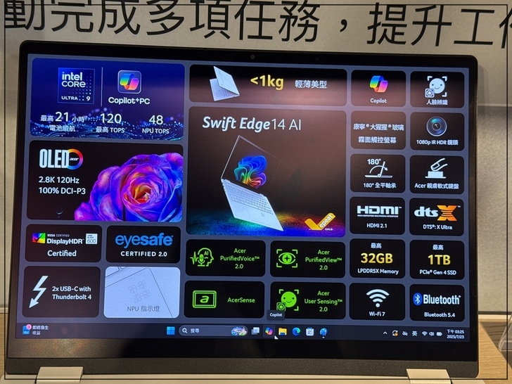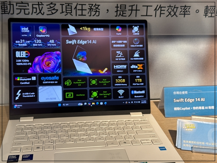 這台筆電是Acer Swift Edge14 AI,面板上顯示的是它的基礎規格。